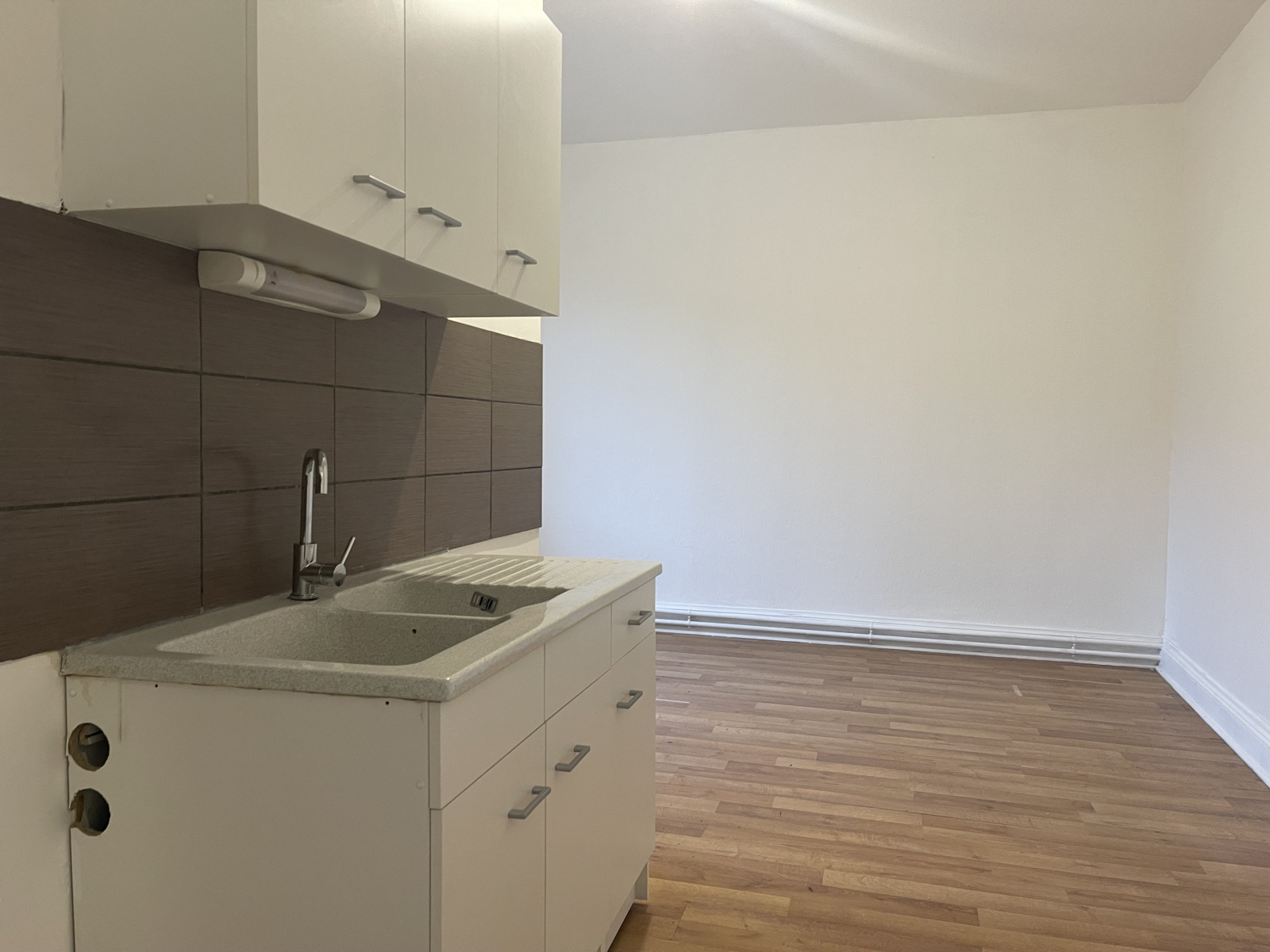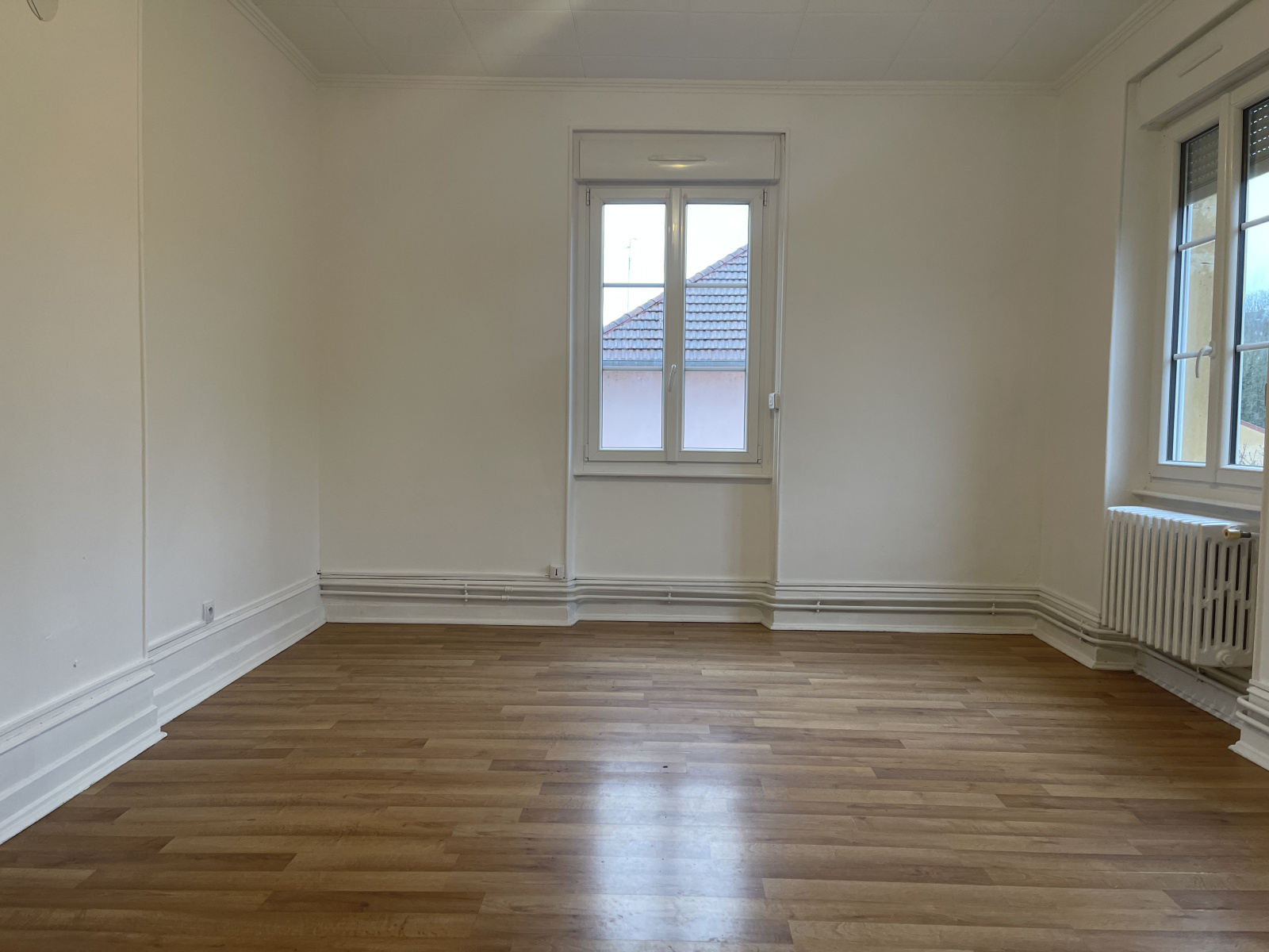 L'appartement est situé au 1er étage d'un petit immeuble. Il se compose d’un séjour, d’une grande cuisine séparée (non équipée), de deux chambres ainsi que d’une salle d'eau.