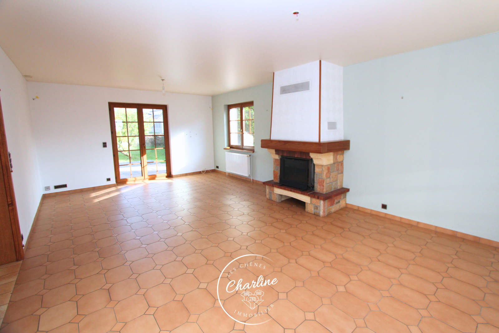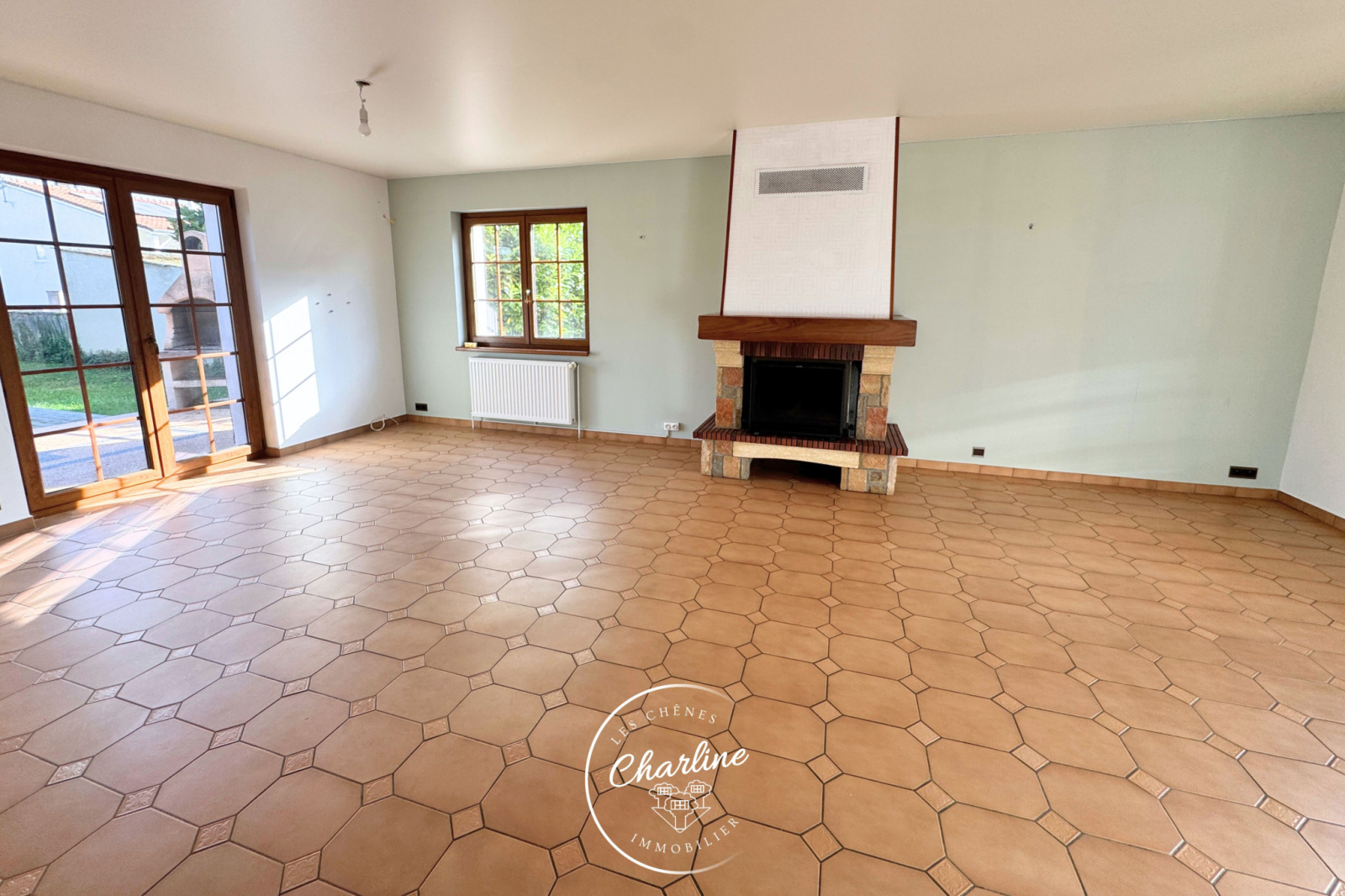 Belle pièce de vie lumineuse avec cheminée, donnant directement sur la terrasse et le jardin arboré.