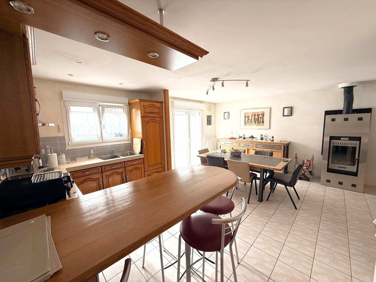 Équipements : chauffage gaz récent, poêle à bois Godin, volets motorisés connectés, alarme et adoucisseur d’eau.